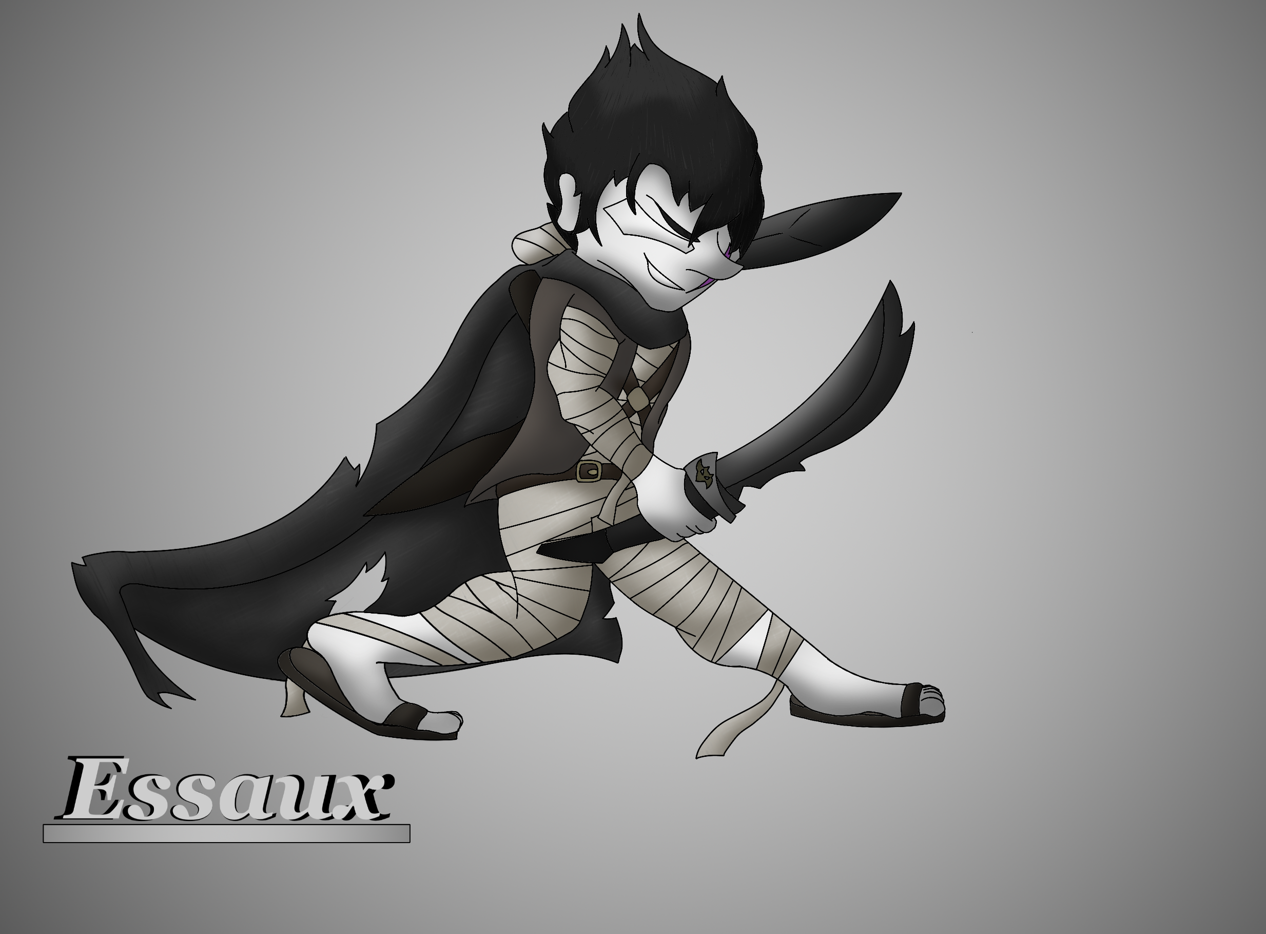 Essaux was originally an assassin for the kings of Ancient Ethosium, hired to destroy the rebels that were threatening the government. He was the best fighter in the entire city of Ethosium, efficiant with both espionage and dual-weilding the sister blades, Vendetta and Black Rose. He was defeated, however, by one of the rebels weilding a Shadow's Bane weapon. His failure he accounted to his own conscience, which had remained with him despite his continued attempts to put it down.